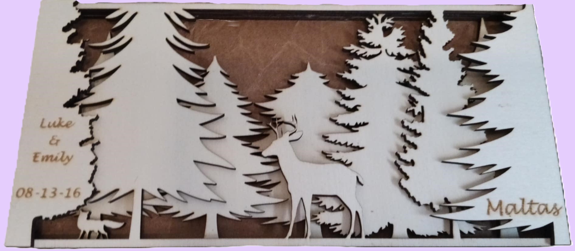 3D Layered Deer in Woods Sign, Perfect for Wedding, Anniversary, Valentines, ect. About 7 1/2″ wide, 4″ tall, 1/2″ thick. It comes with options to hang on the wall or a stand for a shelf. Can be personalized with names or dates. This product is made to order. Please allow two weeks before shipping.